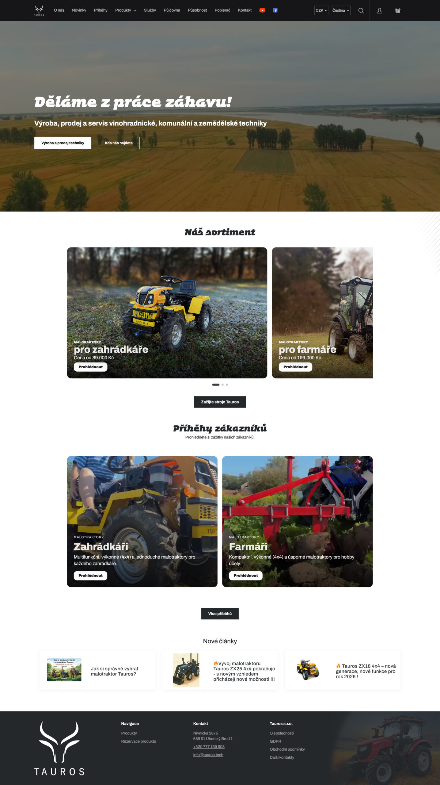 Pro e-shop TAUROS.tech, zaměřený na prodej traktorů, malotraktorů, minibagrů a příslušenství, jsme realizovali kompletní redesign na platformě Shoptet s rozsáhlým programováním na míru. Cílem bylo vytvořit přehledný a funkční e-shop, který zvládne široké produktové portfolio a usnadní zákazníkům výběr správné techniky.